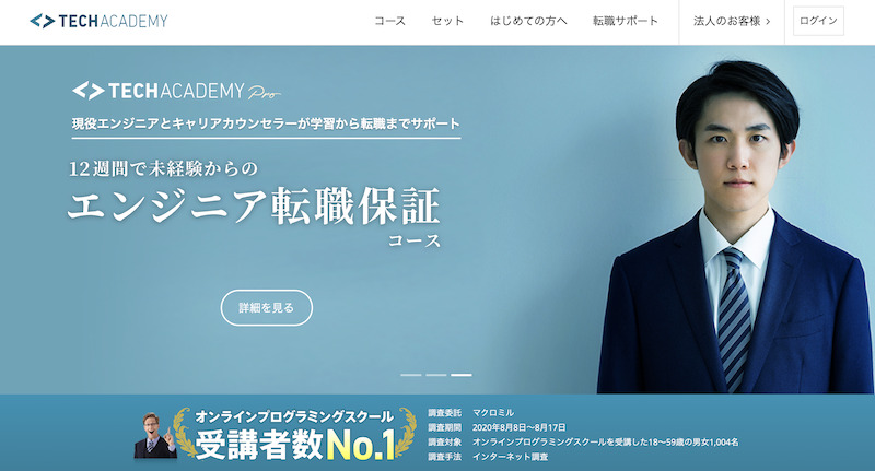 | 豊富なコースが特徴。マンツーマンサポートのわりに料金がリーズナブル! | TechAcademy 公式サイトを見る |